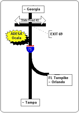 On I-75 exit 69 (HWY 40) go West for about 300 ft. Turn left between the Comfort Inn and Glen Miller Realty. 1/2 Mile to ADESA-Ocala, the Auction of Excellence!